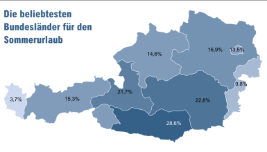 „Wer braucht das Meer, wenn er unsere mit bester Wasserqualität Seen haben kann?“, zeigt Veit die Top-Regionen des heurigen Sommers auf: Am beliebtesten ist Kärnten mit 28,6% gefolgt von der Steiermark mit 22,8% und Salzburg mit 21,7%. Unentschlossen äußerten sich noch knapp 12% der Befragten.