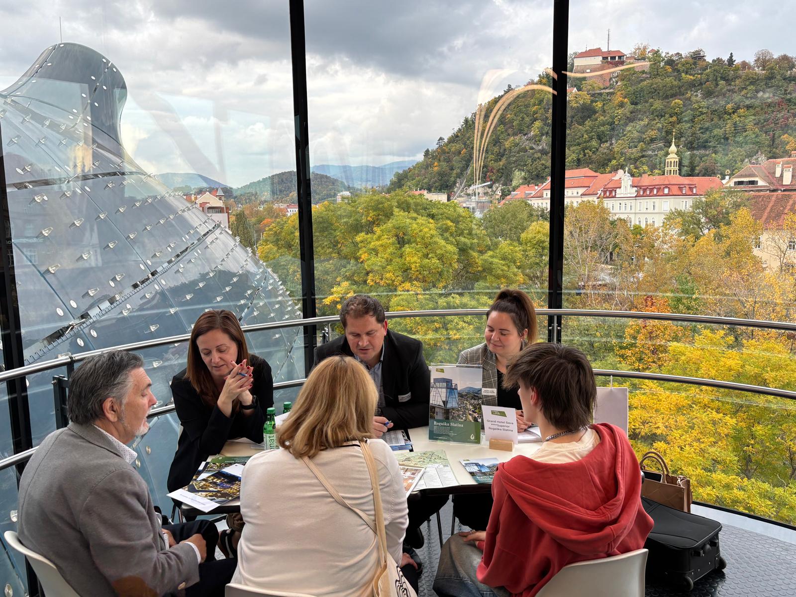 Ein inspirierender Abend in besonderer Kulisse: Über den Dächern von Graz fand ein Slowenien-Workshop statt, der TouristikerInnen aus Österreich und Slowenien zusammenbrachte. Veranstaltungsort war die gläserne Aussichtsplattform „Needle“ im Kunsthaus Graz mit Blick auf die Altstadt, den Schloßberg und den Uhrturm.