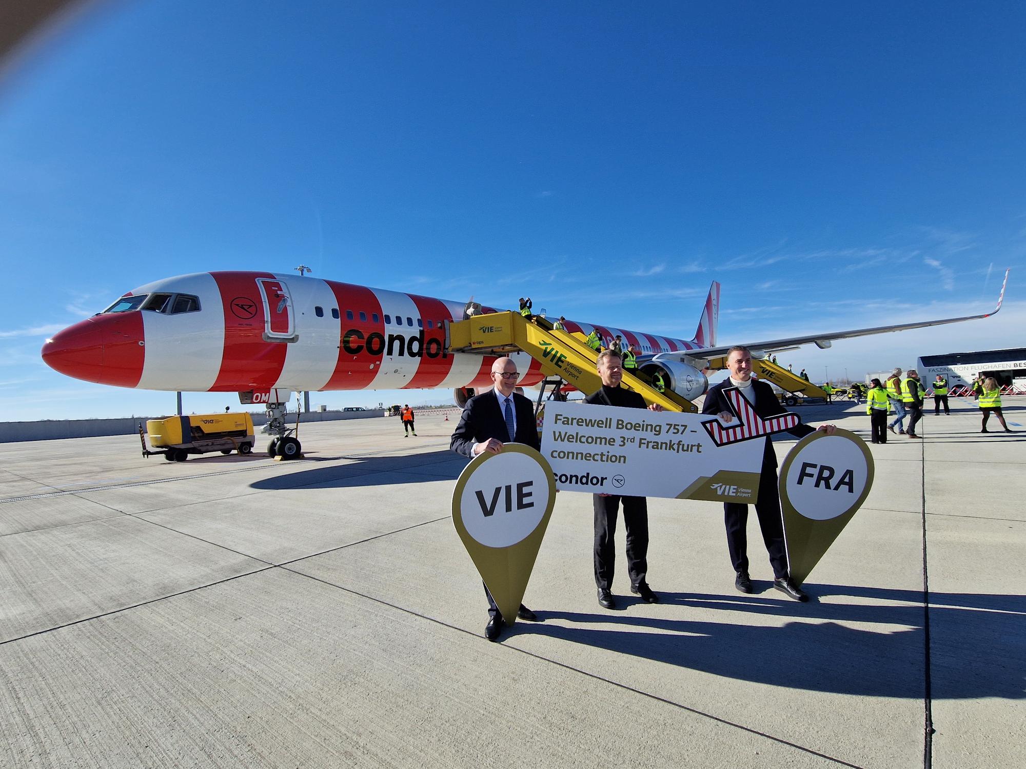 Sie gilt als eine Ikone der Luftfahrt: die B757-300, die seit 1990 für Condor im Einsatz war. Entstanden ist die langgestreckte, schlanke Maschine, die Platz für 275 Passagiere bietet, auf Betreiben der deutschen Fluglinie. „Condor ist sozusagen Vater und Mutter der B757-300, sie brachte Boeing dazu, die 757 zu stretchen“, erzählt Peter Gerber, CEO Condor, beim Abschieds-Event in Wien. Zur Veranstaltung war die letzte B757-300, die heute ausgeflottet wird, aus Frankfurt nach Wien geflogen, besetzt mit Medien-Vertretern, Condor-Mitarbeitenden und -Fans. Warum ausgerechnet Wien?