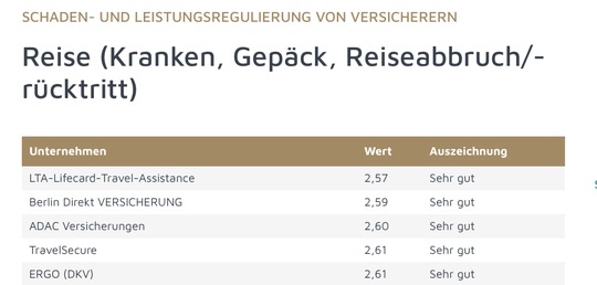 In der aktuellen Studie der ServiceValue GmbH in Kooperation mit Focus Money belegt LTA den ersten Platz und erhält erneut die Bewertung „Sehr gut“. Damit wird das Unternehmen bereits zum neunten Mal in Folge für seine "faire und kundenorientierte" Schadenregulierung ausgezeichnet. Insgesamt wurden 37 Anbieter untersucht. 16 Versicherer erreichten die Bewertung „Sehr gut“. An der Spitze liegt die Lifecard-Travel-Assistance mit einem Mittelwert von 2,57, gefolgt von der Berlin Direkt Versicherung (2,59) und den ADAC Versicherungen (2,60).