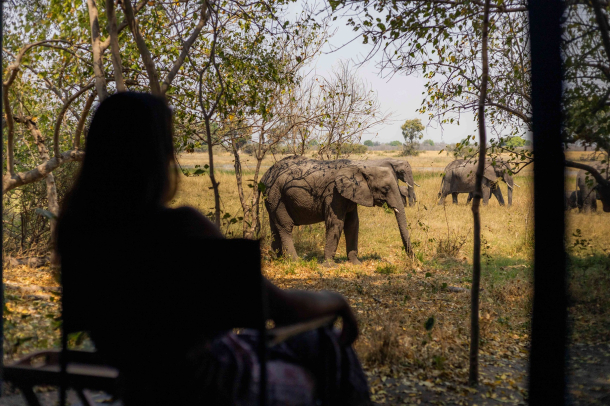 Die Umgebung des Camps zählt zu den artenreichsten Gebieten des Deltas und ist geprägt von saisonalen Überschwemmungsflächen, offenen Ebenen und dichter Vegetation. Direkt vor dem Camp lassen sich regelmäßig Elefanten, Antilopen und Büffel beobachten, während auch Raubtiere wie Löwen, Leoparden, Geparden und afrikanische Wildhunde in der Region vorkommen. Zum Aktivitätenangebot gehören Pirschfahrten bei Tag und Nacht, Mokoro-Ausflüge durch Papyruskanäle sowie Bootsfahrten auf den Wasserwegen. Optional werden Helikopterflüge zu den Tsodilo Hills angeboten. Die Saison läuft jährlich vom 1. April bis zum 9. Jänner, die Preise beginnen bei 875 USD pro Person und Nacht. Mehr Infos